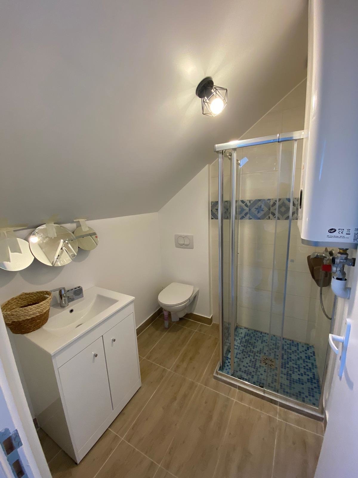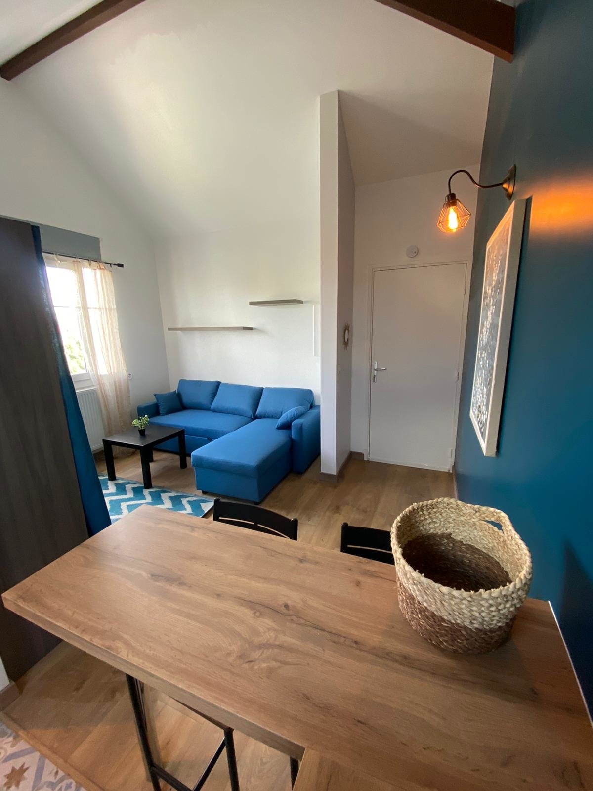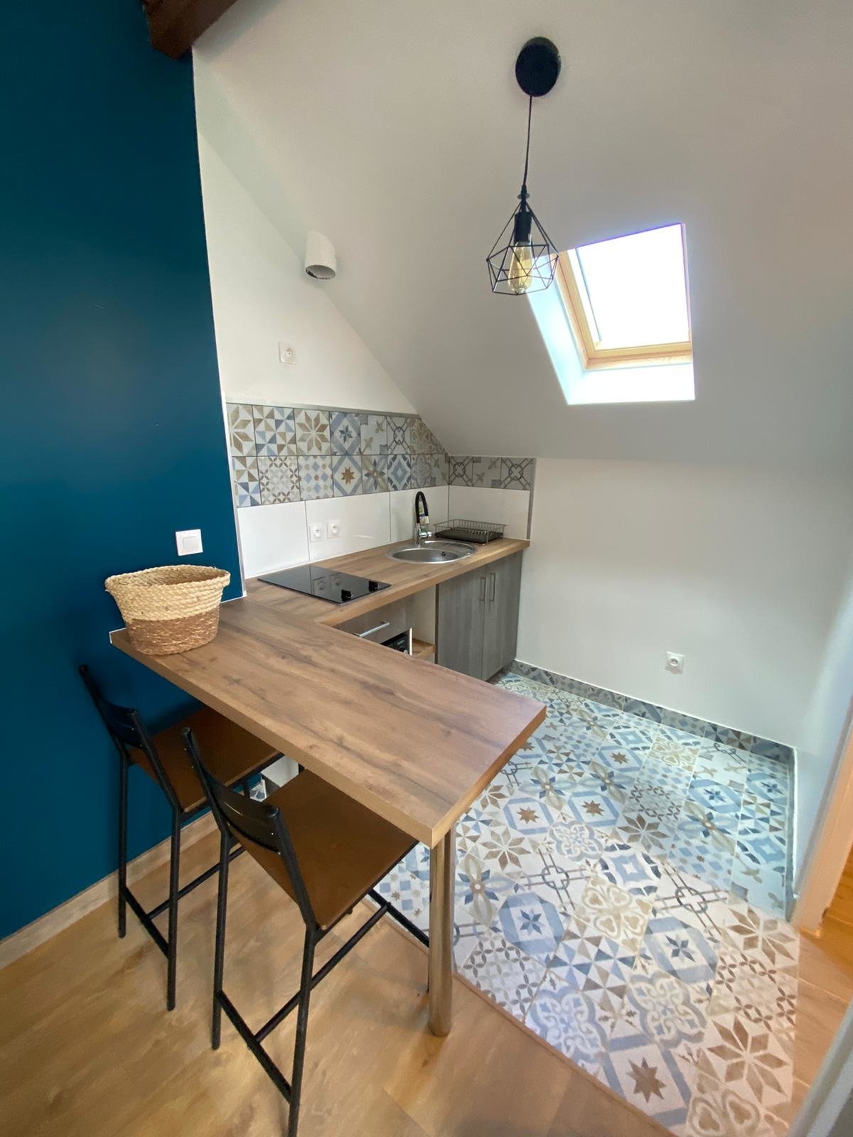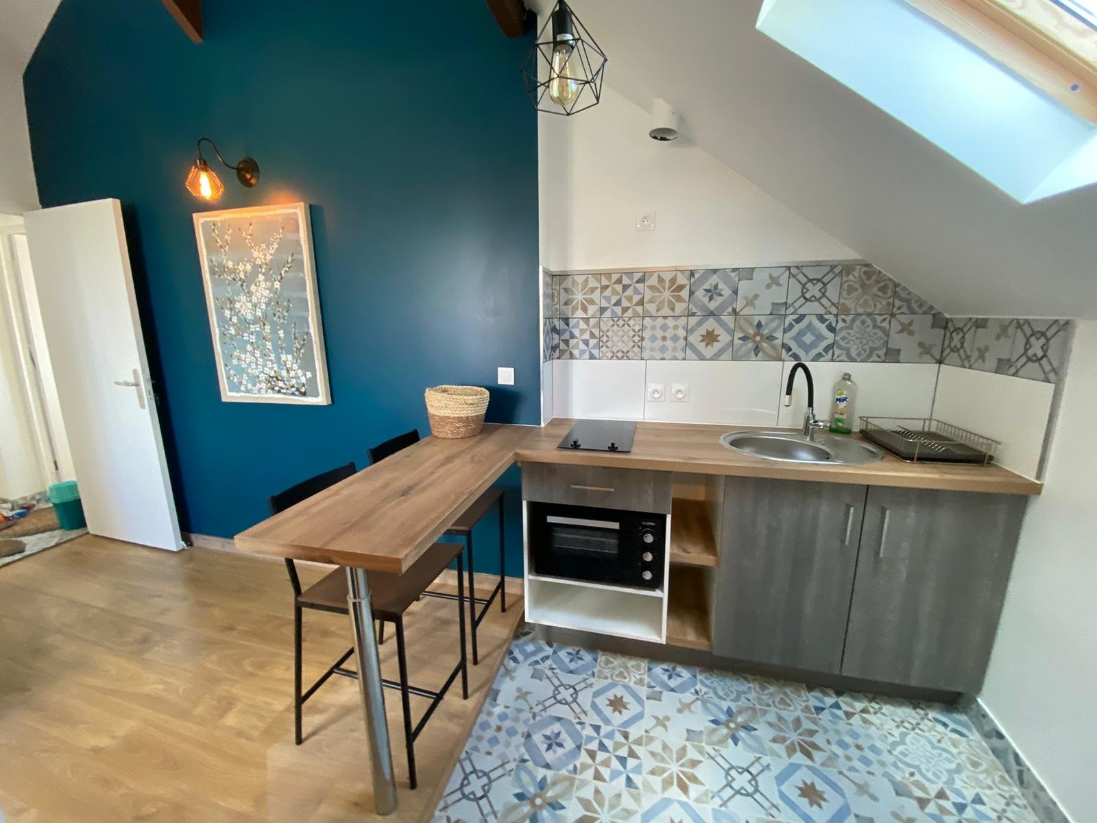 Il s’agit d’un studio meublé avec poutre apparente, parquet, carrelage et entiérement équipé :