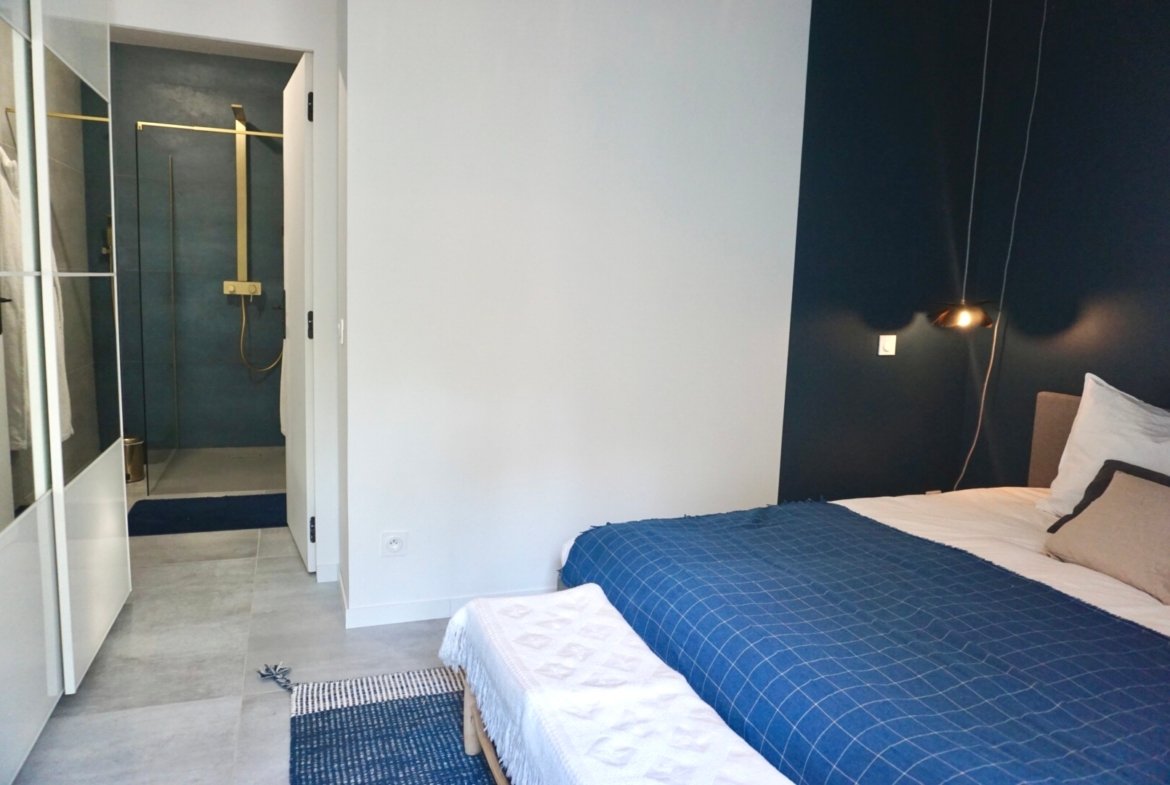 - 1 suite parentale en bas avec salle de douche et WC. Un patio extérieur arboré de 25m2 est accessible par la baie vitrée