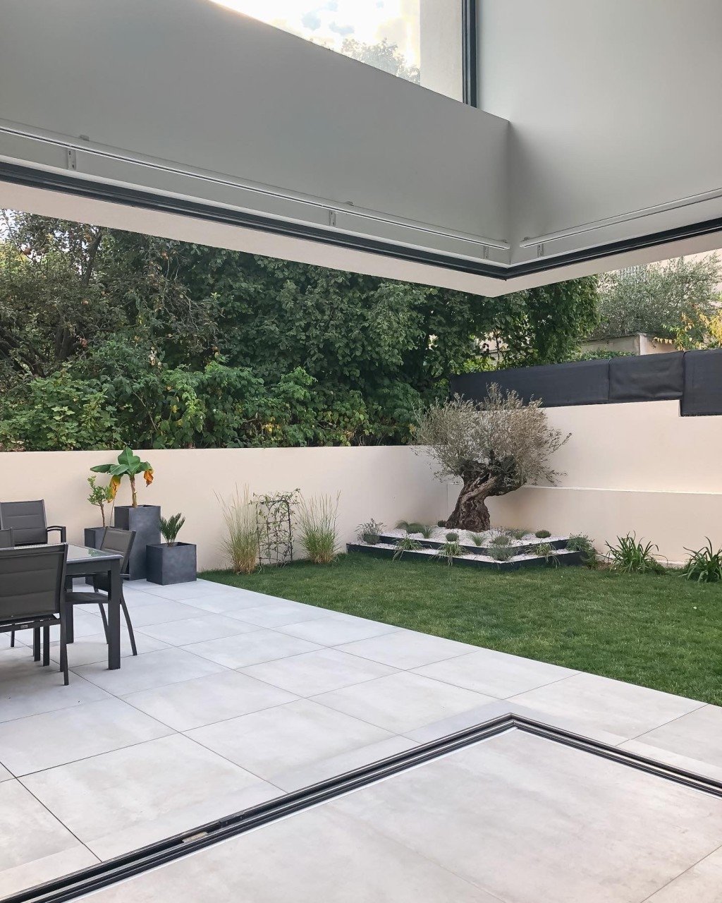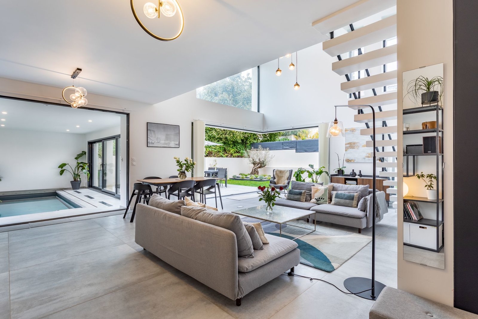 - piscine intérieure à fond mobile (peut disparaître totalement) ce qui permet d’avoir un jardin d’hiver.