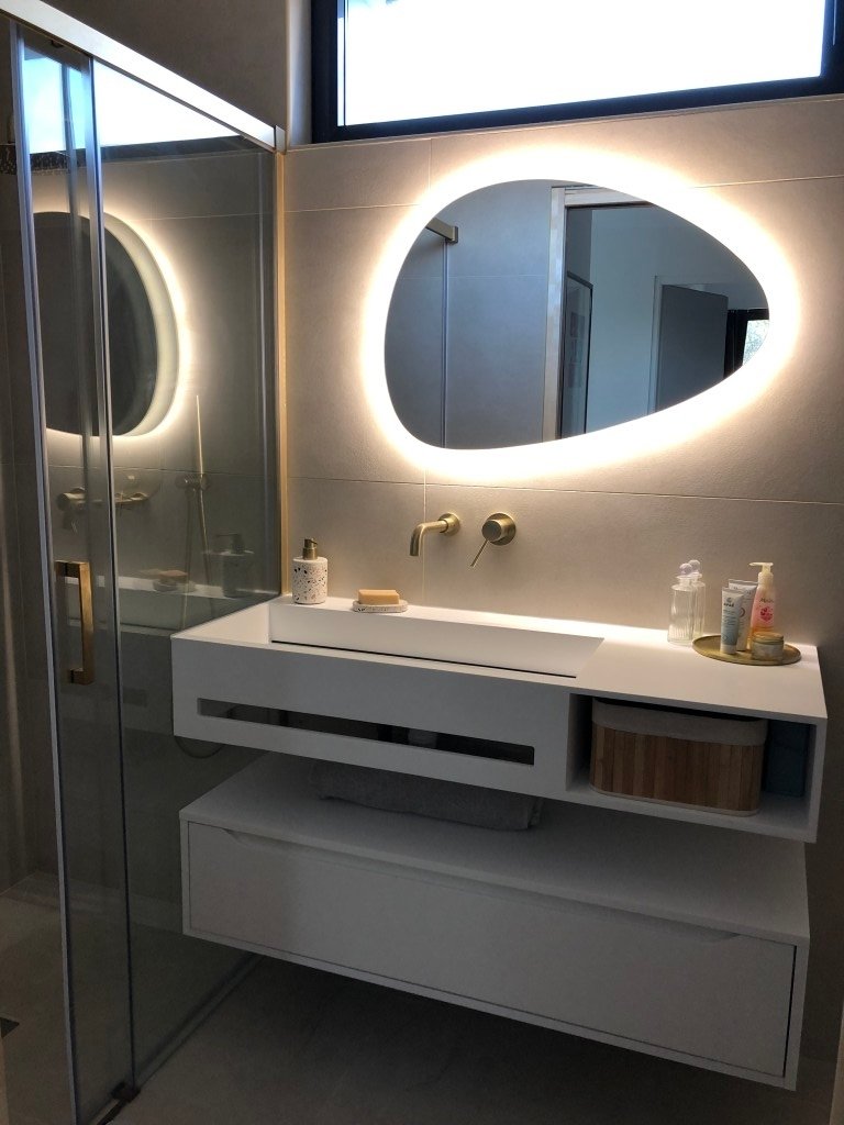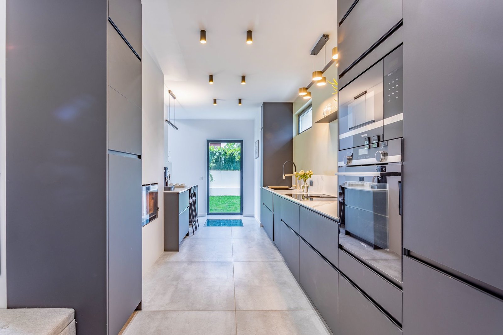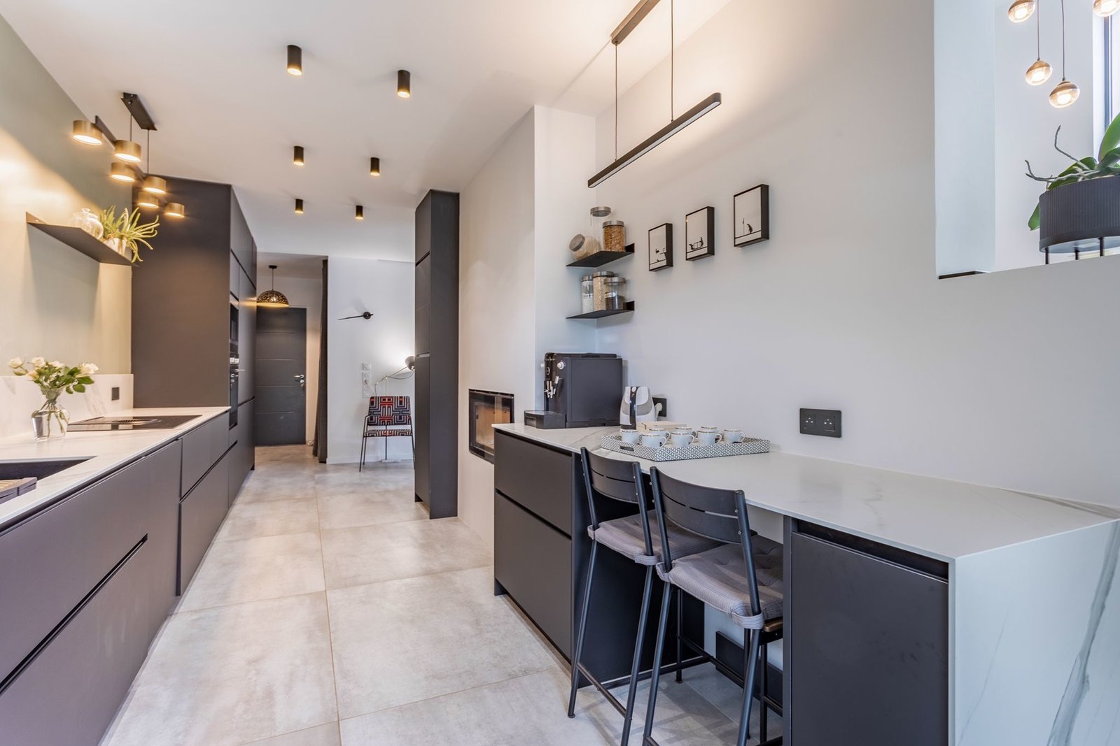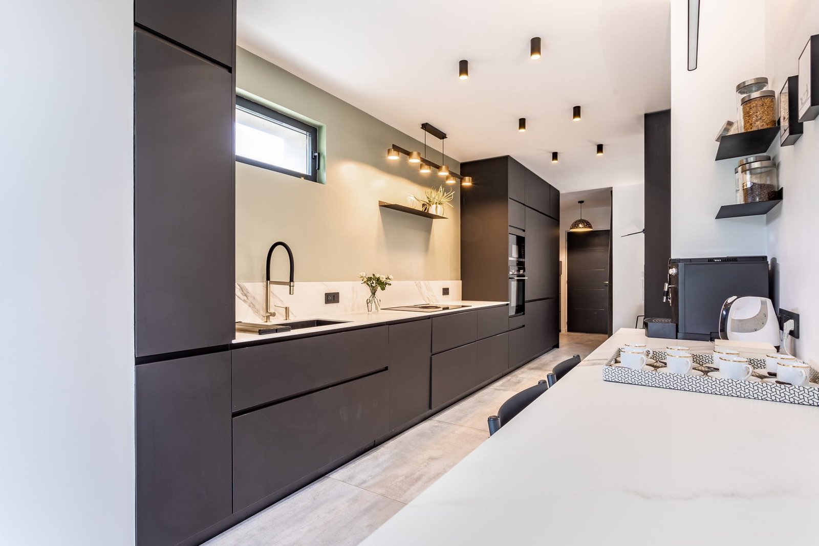 - cuisine de 16m2 ouverte avec deux linéaires et cheminée. Une vitre au sol permet de voir le parking en dessous si voulu.