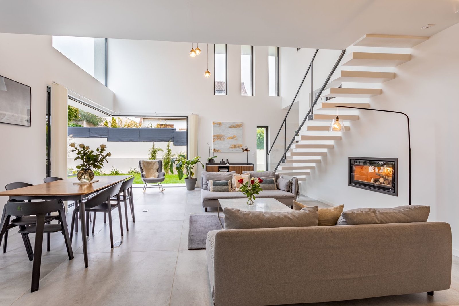 Un espace extrêmement lumineux et calme. Une cheminée à double foyer entre salon et cuisine et de nombreuses prises au sol