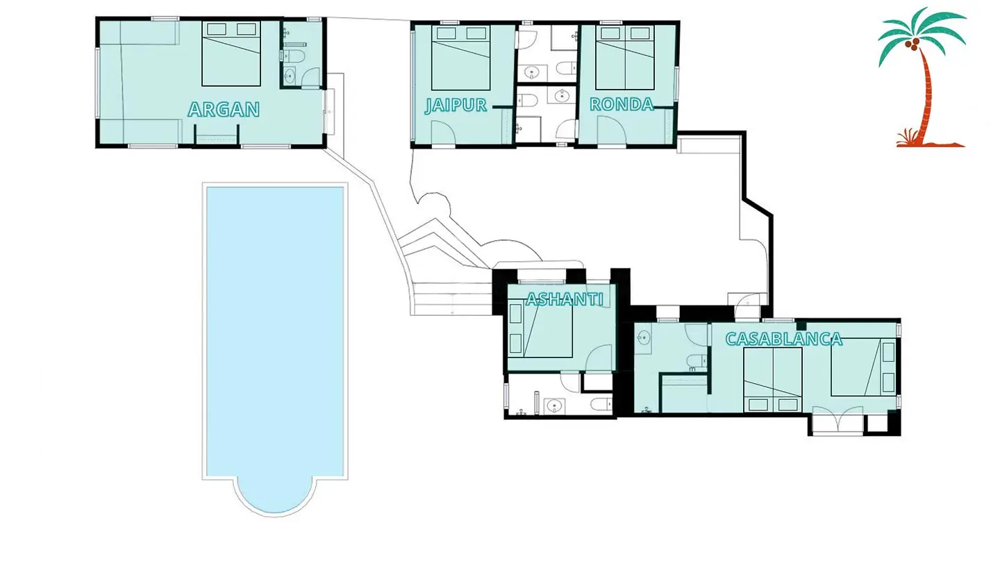 - 5 chambres "bungalows" avec leur salle d'eau. Entrées indépendantes (voir plan)