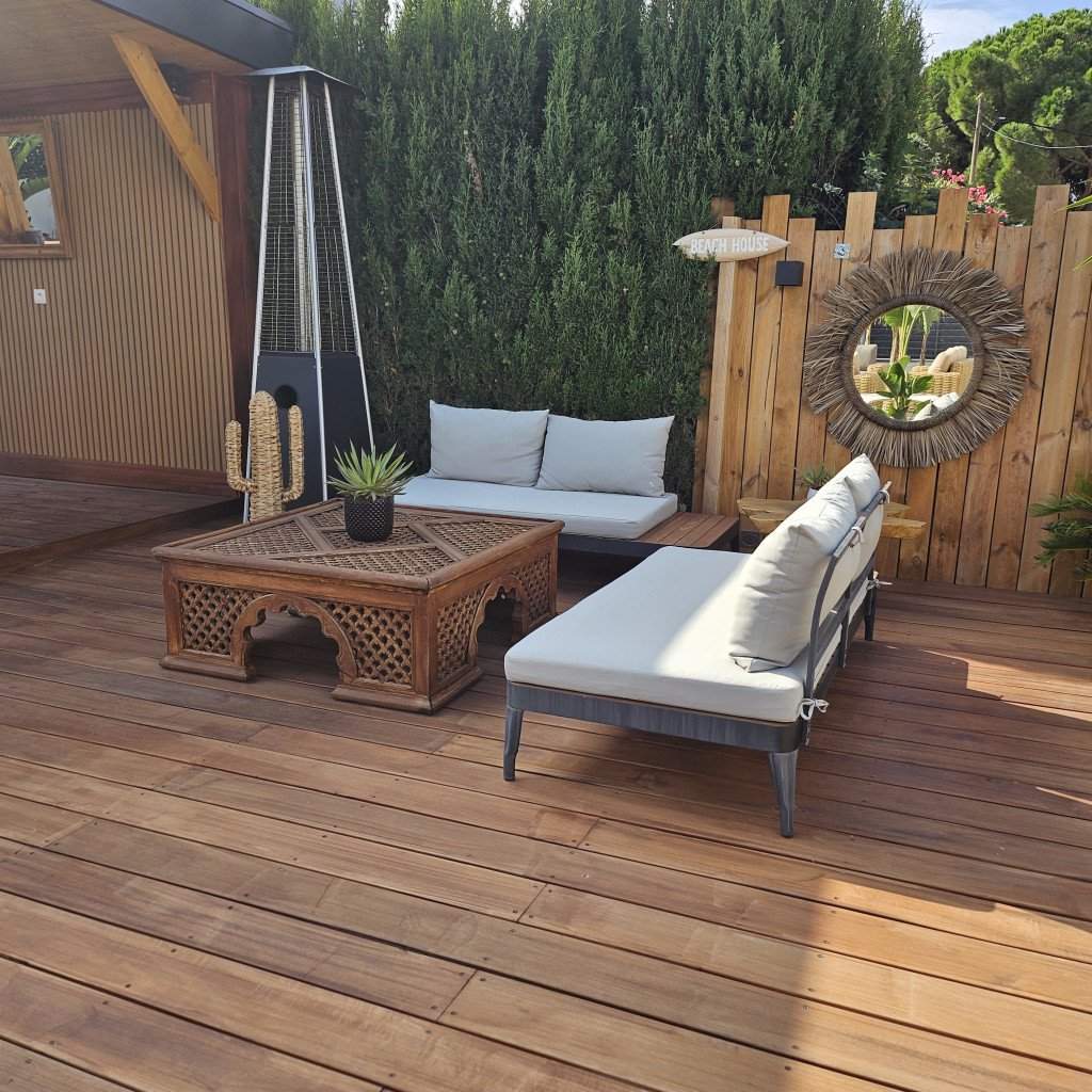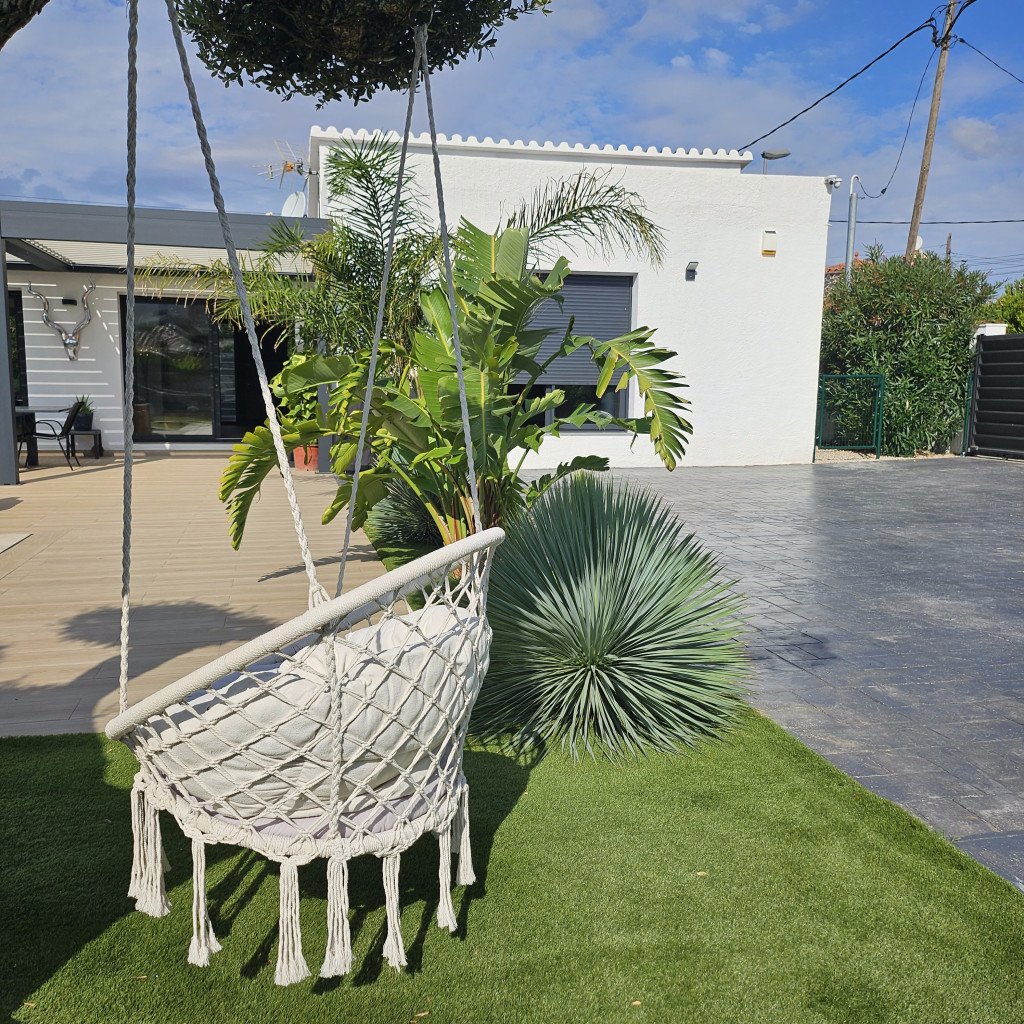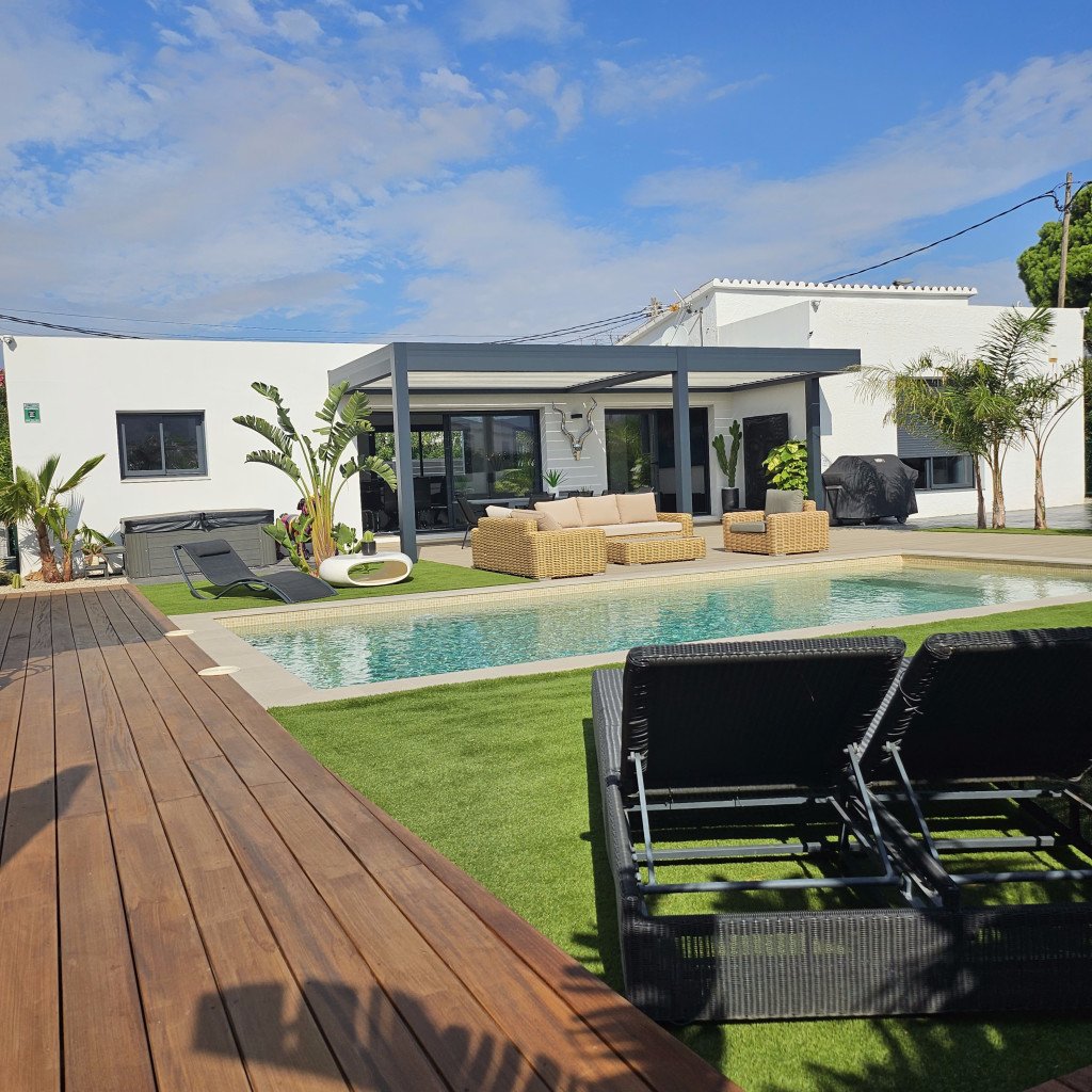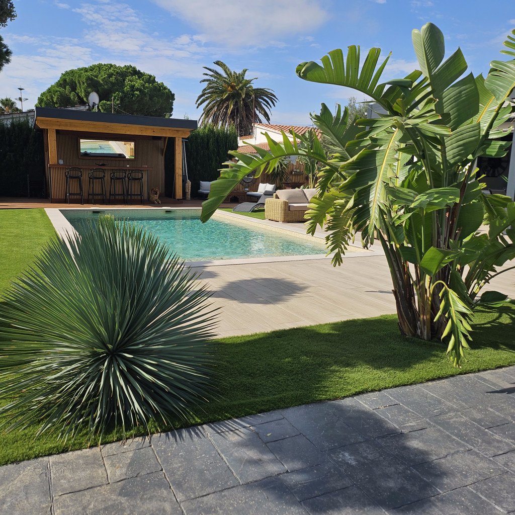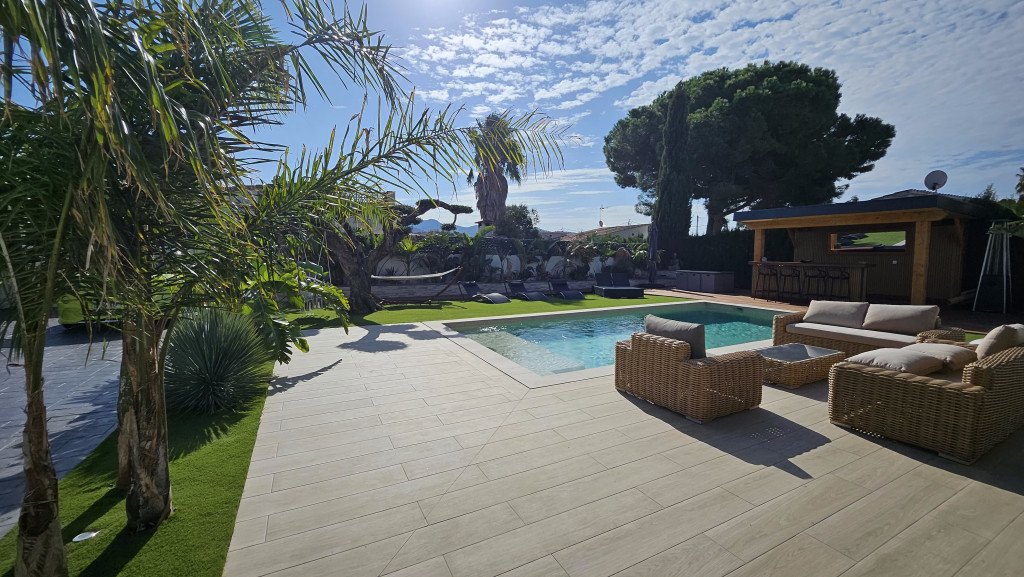 Plusieurs zones de détente distinctes : un bar/cuisine extérieure, un salon de style marocain, un salon type Bali, un jacuzzi et une grande pergola de 30 m² avec un salon extérieur pour 12 personnes. Ces espaces offrent une variété de décors en un seul lieu.