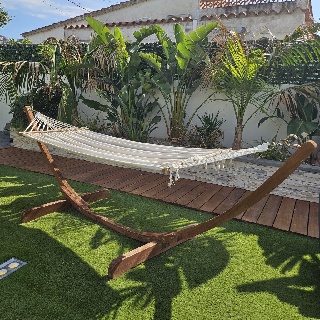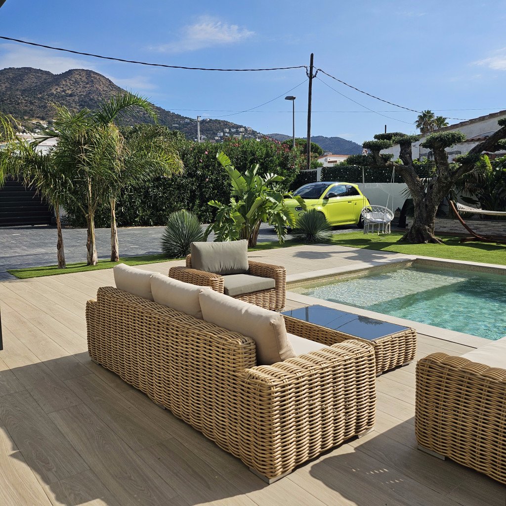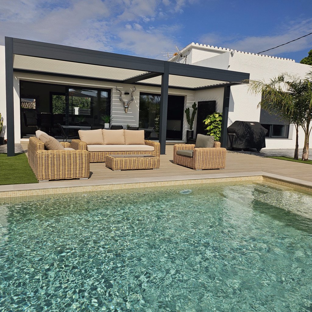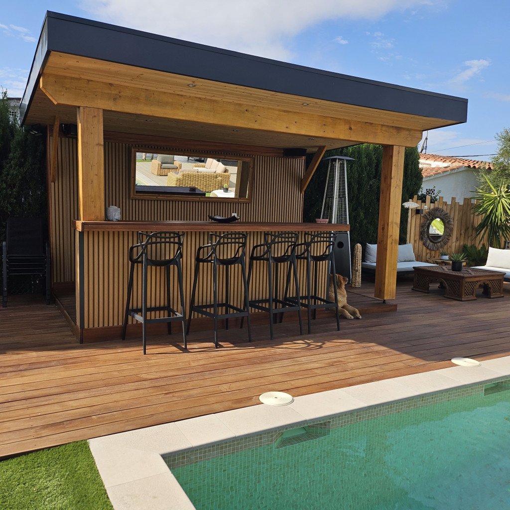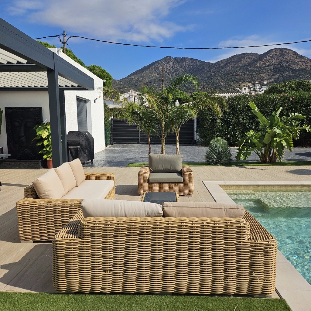 Plusieurs zones de détente distinctes : un bar/cuisine extérieure, un salon de style marocain, un salon type Bali, un jacuzzi et une grande pergola de 30 m² avec un salon extérieur pour 12 personnes. Ces espaces offrent une variété de décors en un seul lieu.