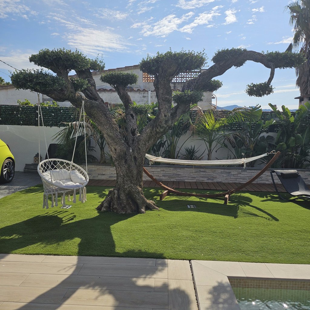 Un jardin paysager avec des plantes exotiques et un magnifique olivier centenaire qui apporte du caractère.