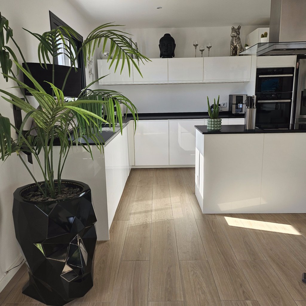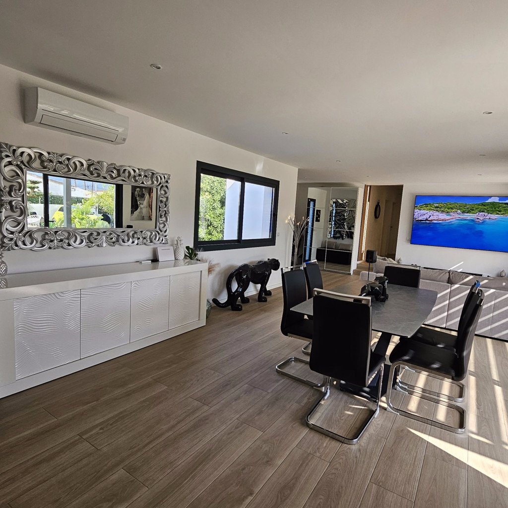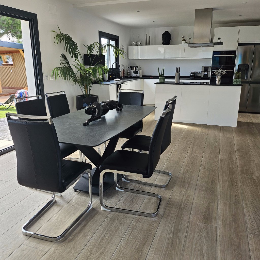Luminosité et Modernité : La pièce de vie de 60 m², baignée de lumière naturelle grâce à de larges baies vitrées, offre une atmosphère épurée et contemporaine. Les tons neutres et le carrelage imitation parquet facilitent l'aménagement et s'adaptent à de nombreux styles de décors. La vue directe sur la piscine ajoute une dimension visuelle forte.