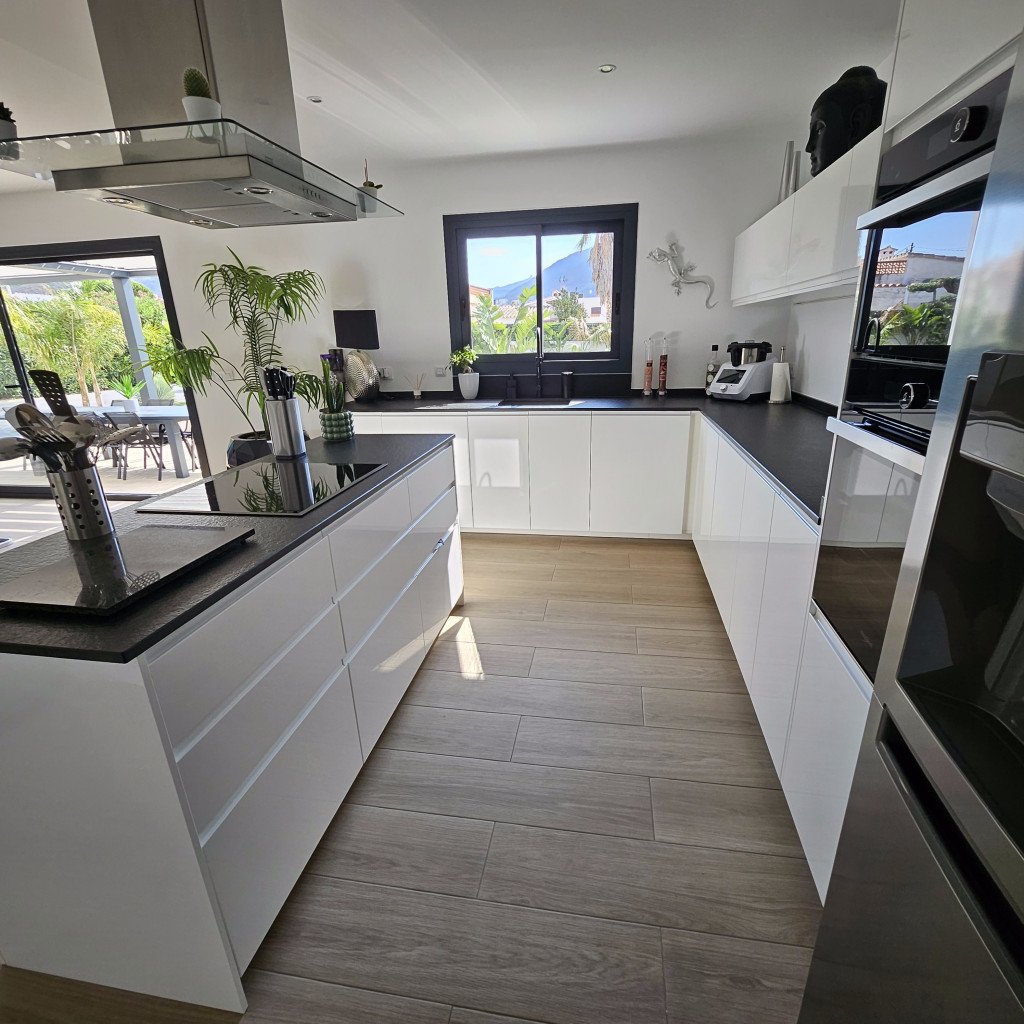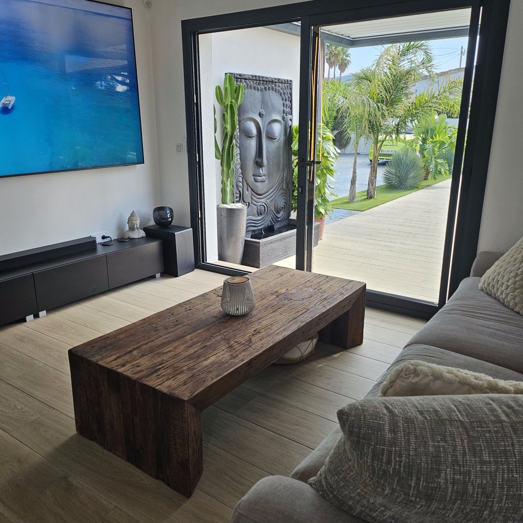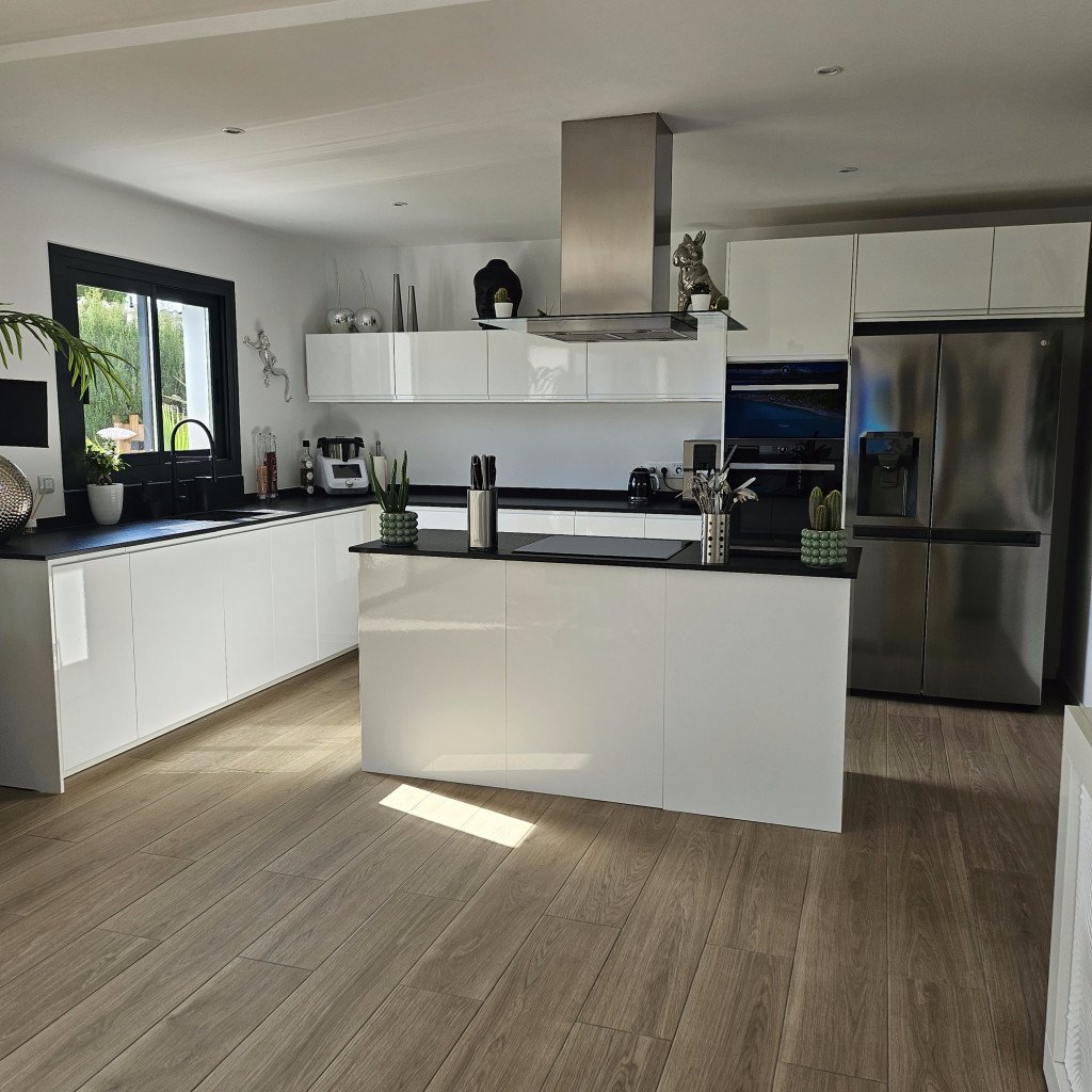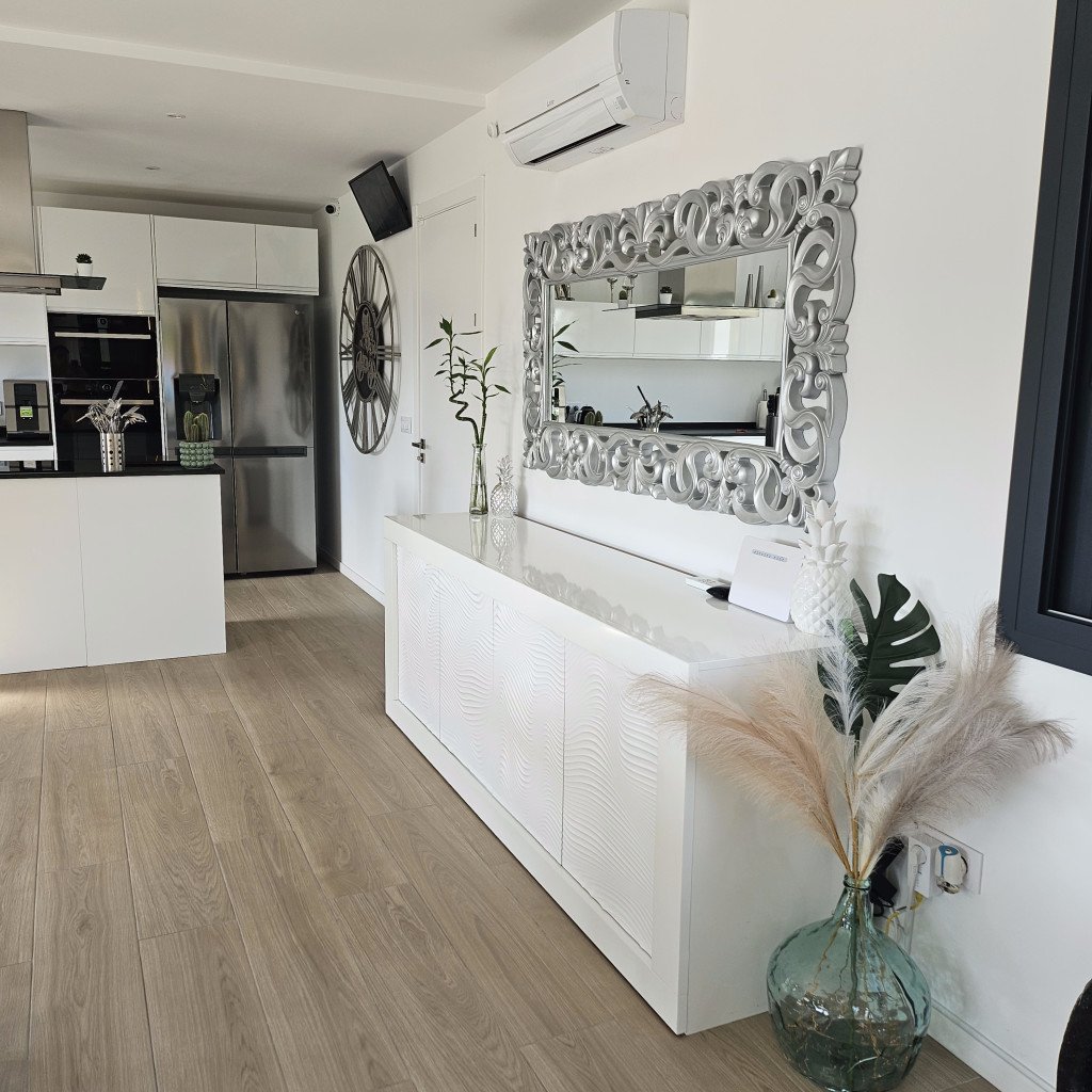 Luminosité et Modernité : La pièce de vie de 60 m², baignée de lumière naturelle grâce à de larges baies vitrées, offre une atmosphère épurée et contemporaine. Les tons neutres et le carrelage imitation parquet facilitent l'aménagement et s'adaptent à de nombreux styles de décors. La vue directe sur la piscine ajoute une dimension visuelle forte.