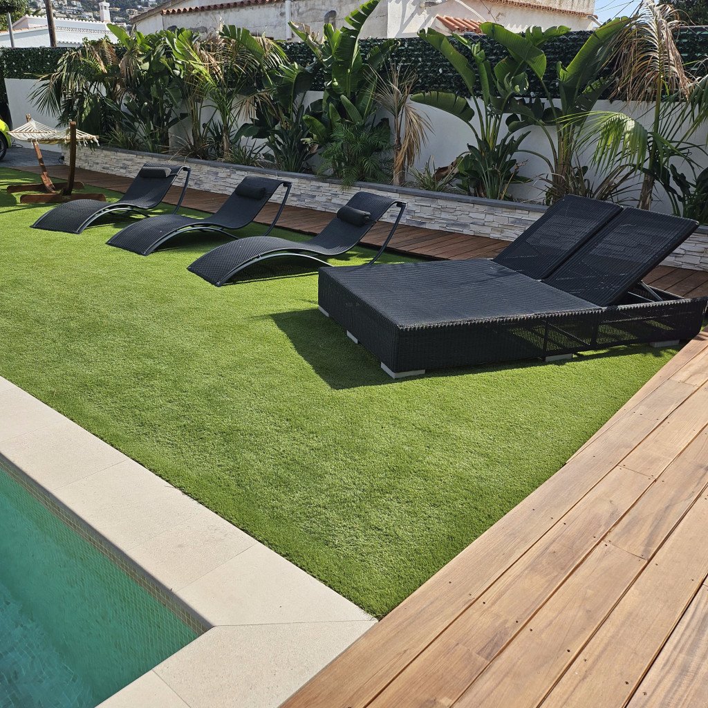 Une piscine en mosaïque ton sable (8x4m) entourée d'une grande terrasse en bois exotique et de gazon synthétique.