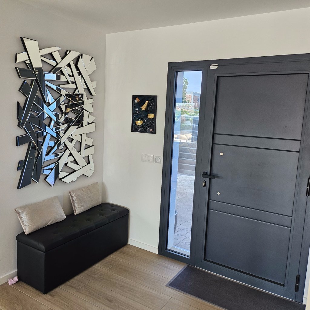 Une entrée avec un pan vitré latéral.
