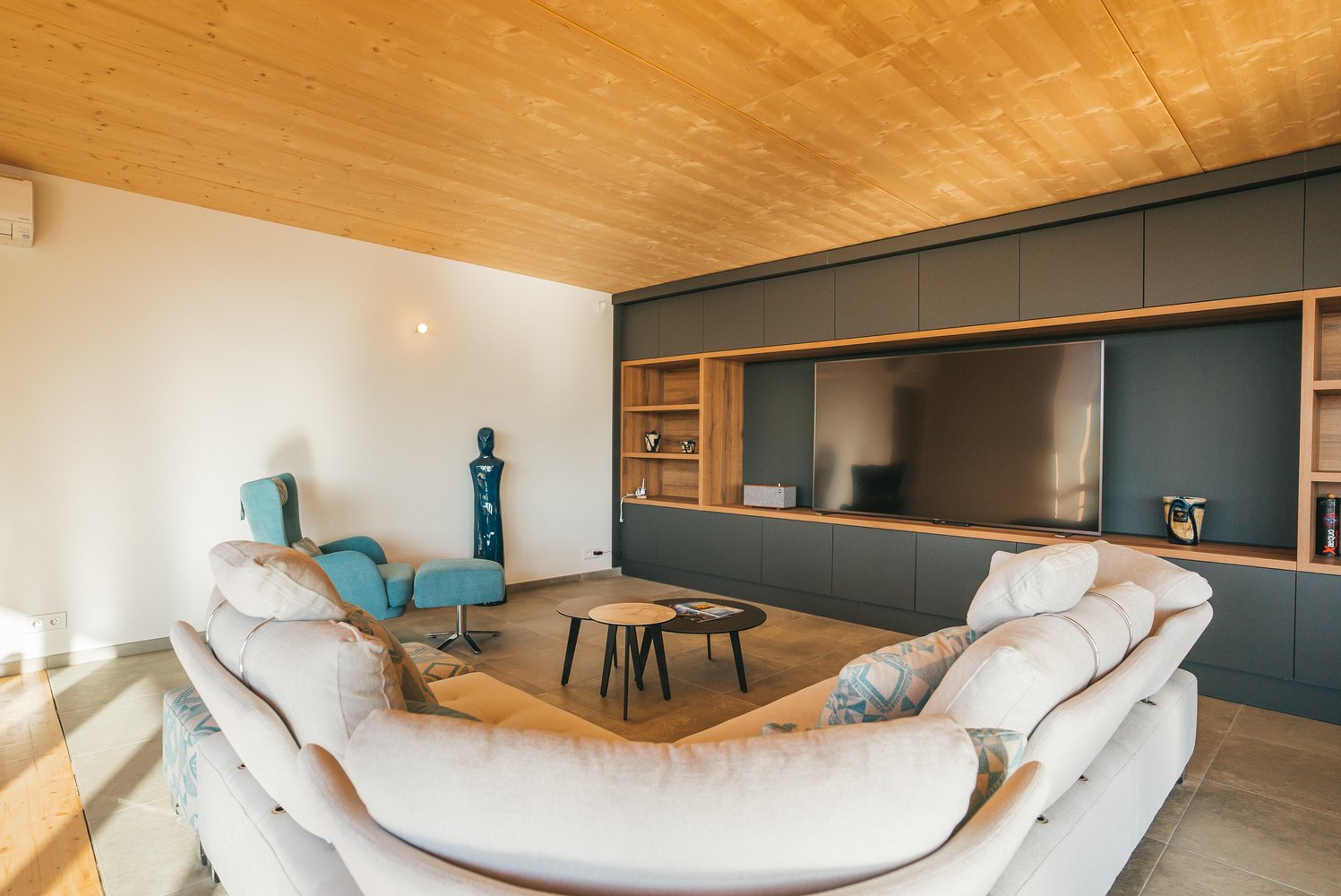 Les baies vitrées de cette pièce donnent accès à une grande terrasse extérieure avec espace repas et espace détente, donnant vue sur la piscine et la montagne.
