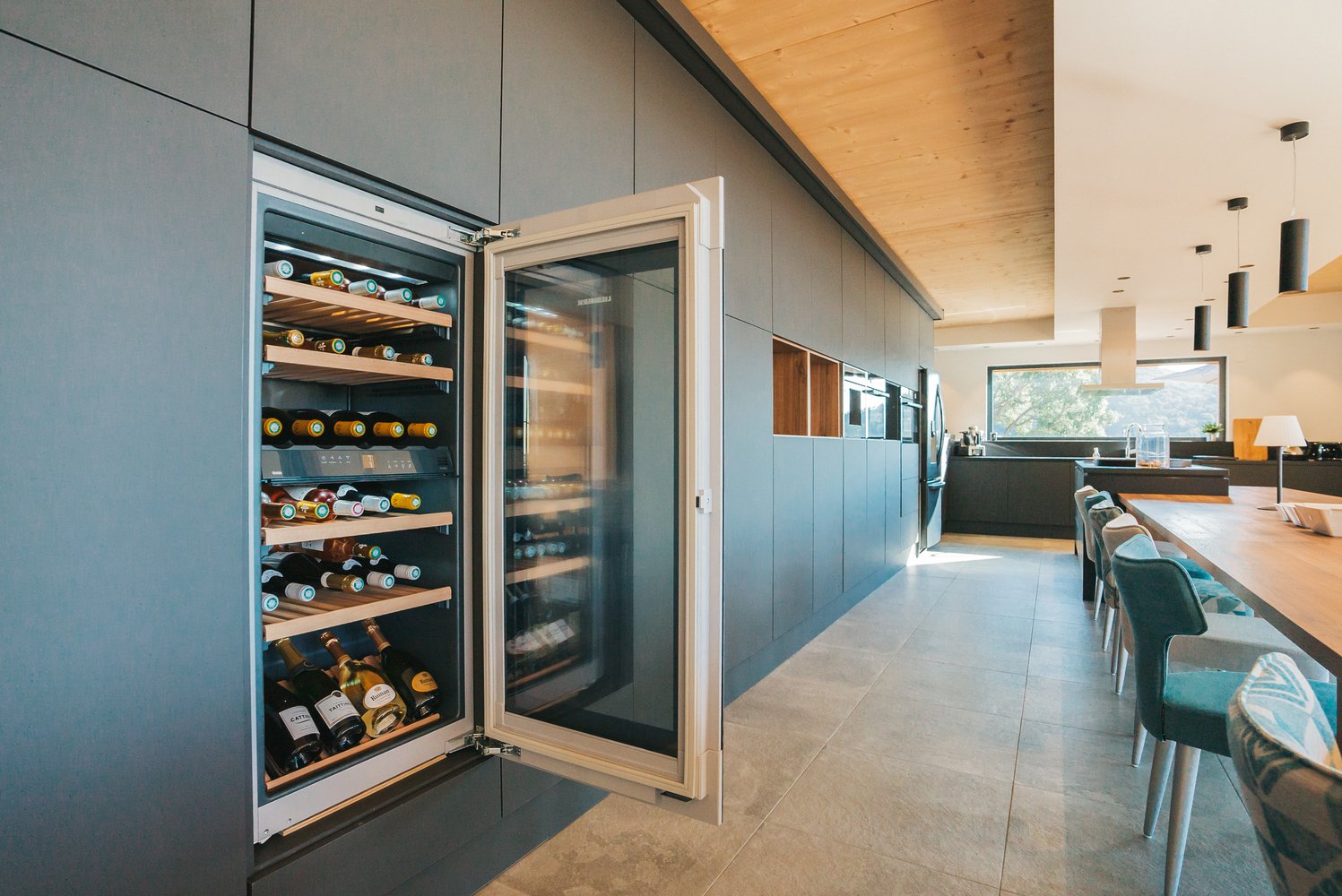 - La pièce de vie (110M²) avec une longue table en bois noble dans la continuité de l'îlot de la cuisine américaine, espace salon