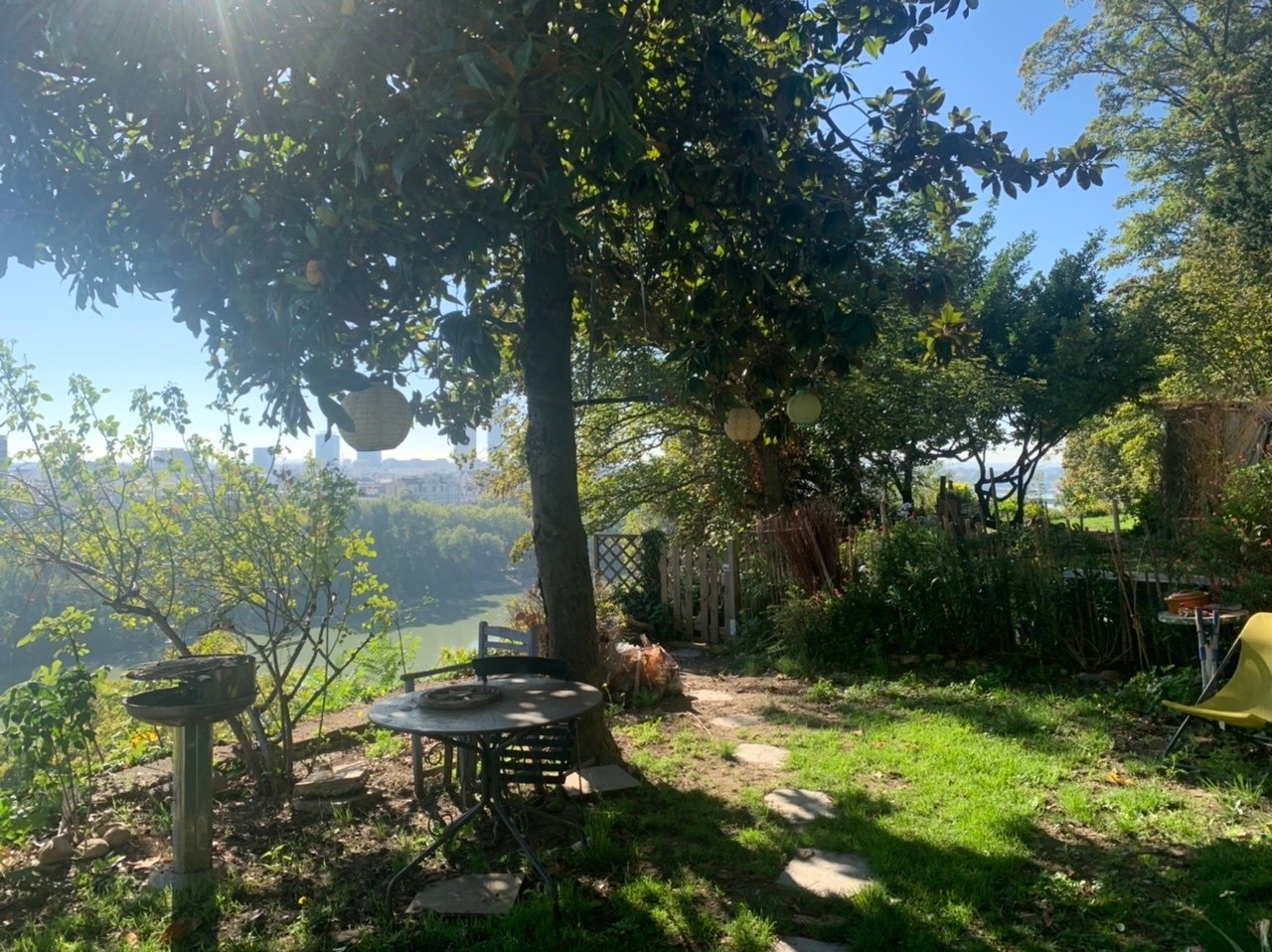 Jardin attenant avec vue panoramique sur fleuve.