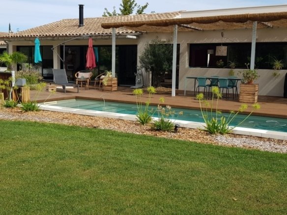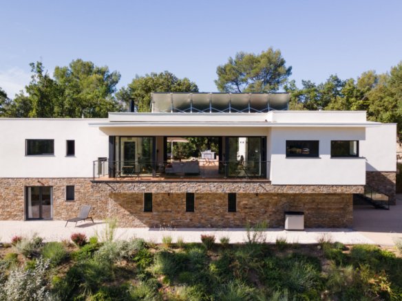 Villa d’architecte contemporaine de plein pied avec jardin paysagé comprenant : Grande...