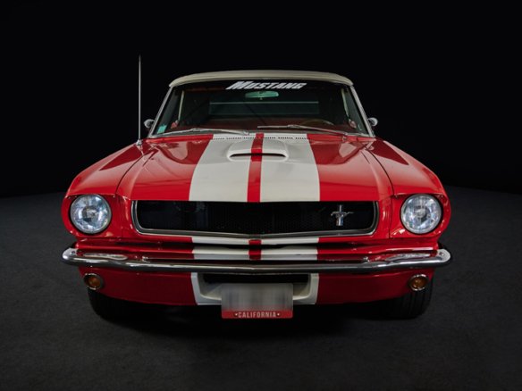 Ford Mustang Cabriolet (1965) – couleur extérieure : rouge avec bandes blanches...